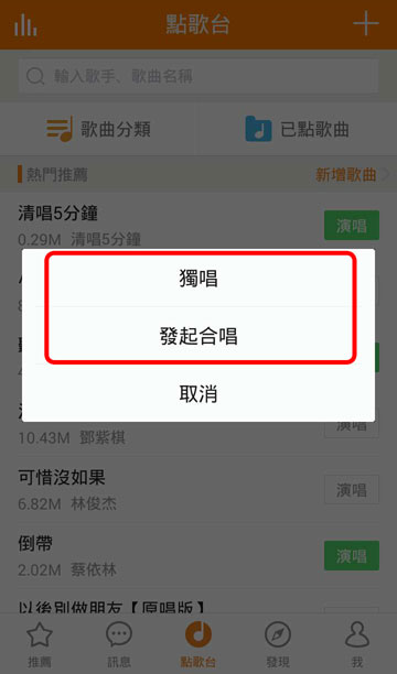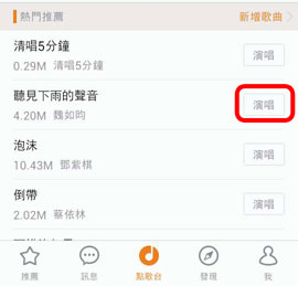 在點歌台找到你想要唱的歌,點按【點唱】,然後等待下載,下載完成後,點按【演唱】即可錄歌。如下圖所示:
