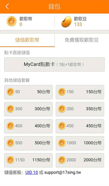 在【我】的頁面中點按【錢包】,可以直接通過mycard點數卡進行儲值,也可以點按選擇您要儲值的金額,再選擇付款方式。 目前歡歌支援的儲值方式有:mycard會員轉點,手機市話儲值,臺灣信用卡及paypal。希望能幫到你。